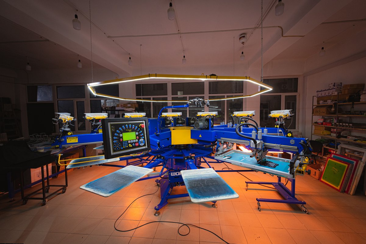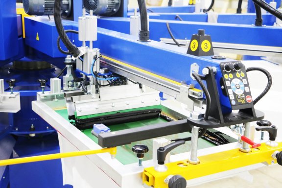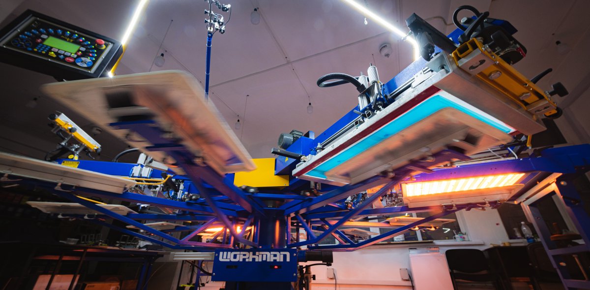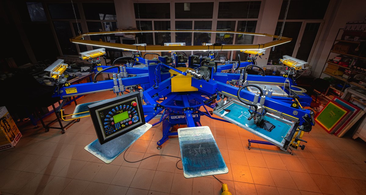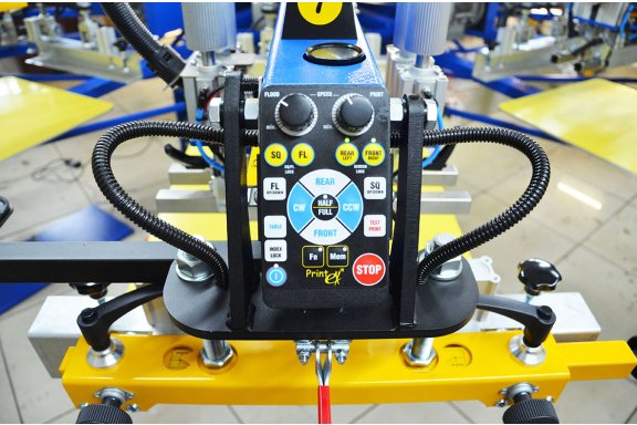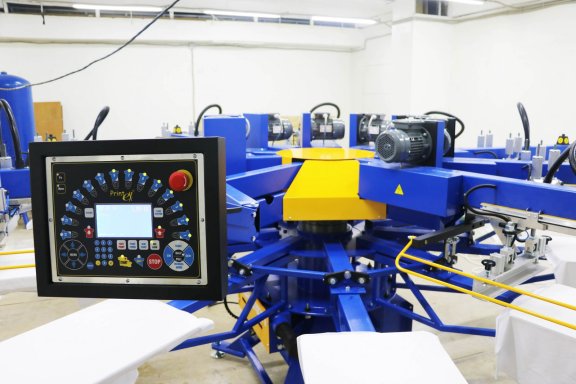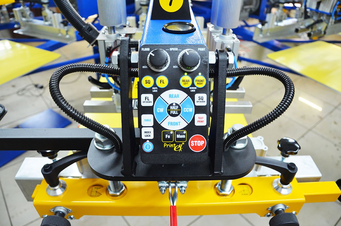 The Workman Series rotary screen printing machine combines in a single design, the cost effectiveness of a pneumatic driven machine with the functionality and convenience of advanced servo driven models. All motions are driven pneumatically and full function membrane keypad control panels on each head give tremendous accessibility. The Workman is equipped with inner and outer print stroke adjustment, fault proof carriage system which eliminates possibility of head crash, and pneumatic screen clamps controlled directly from the print head. The concept behind the evolution of the Workman was to have the small diameter that comes with a cost effective machine, an image area large enough to satisfy most commercial contracts, and efficient operation control. Printable image area on the Workman is 41 x 46 cm (16 x 16") or in 6 station models - up to 58 x 41 cm. An advantage to its compact design, besides its high printing speed, is installation and location flexibility - narrow staircase for floor installation is not a problem with the Workman. The Workman is offered with a maximum spread of 10 stations. We recommend common Loading / Unloading style machine for any shop where a single operator will be managing the printing process. In these scenarios an extra print head is always highly appreciated. In the standard version we have implemented the pneumatic indexer rotation system, pneumatic heads, and pneumatic lifting system. This highly reliable design is engineered to maximize efficiency of the pneumatic indexing system’s inertial forces. Quick-Change pallet system with fast sliding pallets and pallet locator makes pallet placement easy. Standard pallets measure 41 x 56 cm (16 x 22"). The Workman is a fast, reliable, and durable machine. Each head is equipped with a full function membrane panel keypad with the ability to control all major motions and head features without the need to return to the main panel. The Workman has advanced software that includes SEQUENCING features; combine this with CLH flashes to produce the highest printing and curing efficiency.