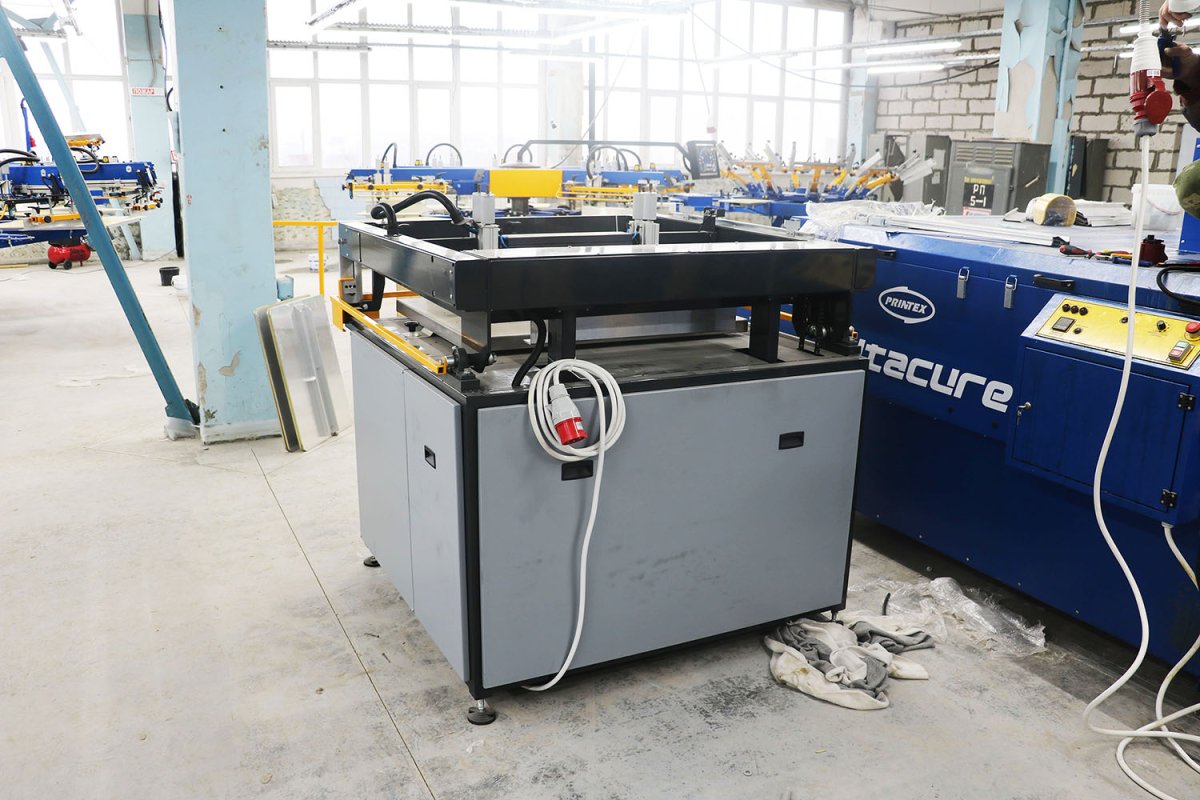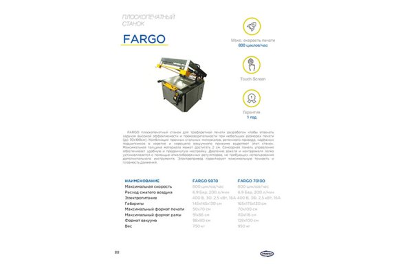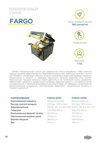 The FARGO flatbed screen printing machine is designed to meet the requirements of high efficiency and productivity in small print sizes (up to 70x100cm). The combination of durable steel materials, a belt drive, reliable carriage bearings, and a good vacuum grip make this machine stand out. The maximum material thickness can reach 2cm. The touch screen control panel provides a user-friendly and advanced setup. The rake and counter-rake pressure can be easily adjusted using calibrated controls that do not require additional tools. The electric drive ensures maximum precision and smooth movements.