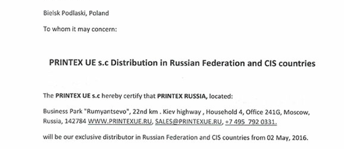 Cо 2 мая 2016 года компания «PRINTEX RUSSIA» получила эксклюзивные права на продвижение, продажу, гарантийное и послегарантийное сервисное обслуживание оборудования компании «PRINTEX UE s.c». Компания...